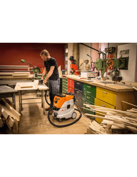 Potente aspiradora para húmedo y seco. Filtro de la clase M, limpieza automática del filtro sin pérdida de potencia de aspiración, control automático del volumen de aspiración, regulación de las revoluciones, adaptador antiestático para la conexión de herramientas de acumulador y eléctricos.