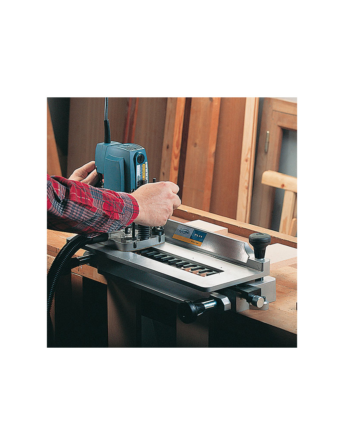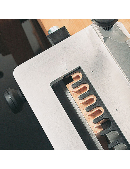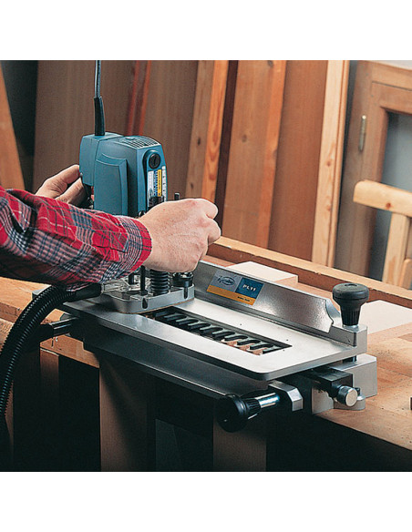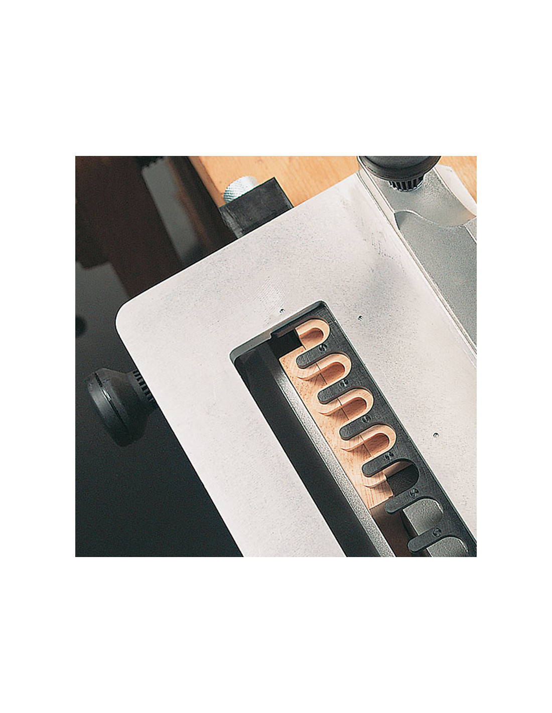 Plantilla de precisión para el ensamblaje mediante lazos. Va equipada de origen con un peine de paso 26 mm, siendo intercambiable según el tipo de lazo que se desee, con otros peines opcionales de diferente paso. Dispone de topes de situación de las piezas a fresar, de forma que al ensamblarlas queden perfectamente enrasadas. Pueden obtenerse distintos aprietes o ajustes en los lazos. Realización de los lazos en ambas piezas de una sola pasada. Puede usarse con nuestras fresadoras FR66P, FR277R, FR278R o AS93 con el cabezal CA66F. · Tipos de lazos Características técnicas Longitud útil máxima: 360 mm Paso por espiga: 26 mm